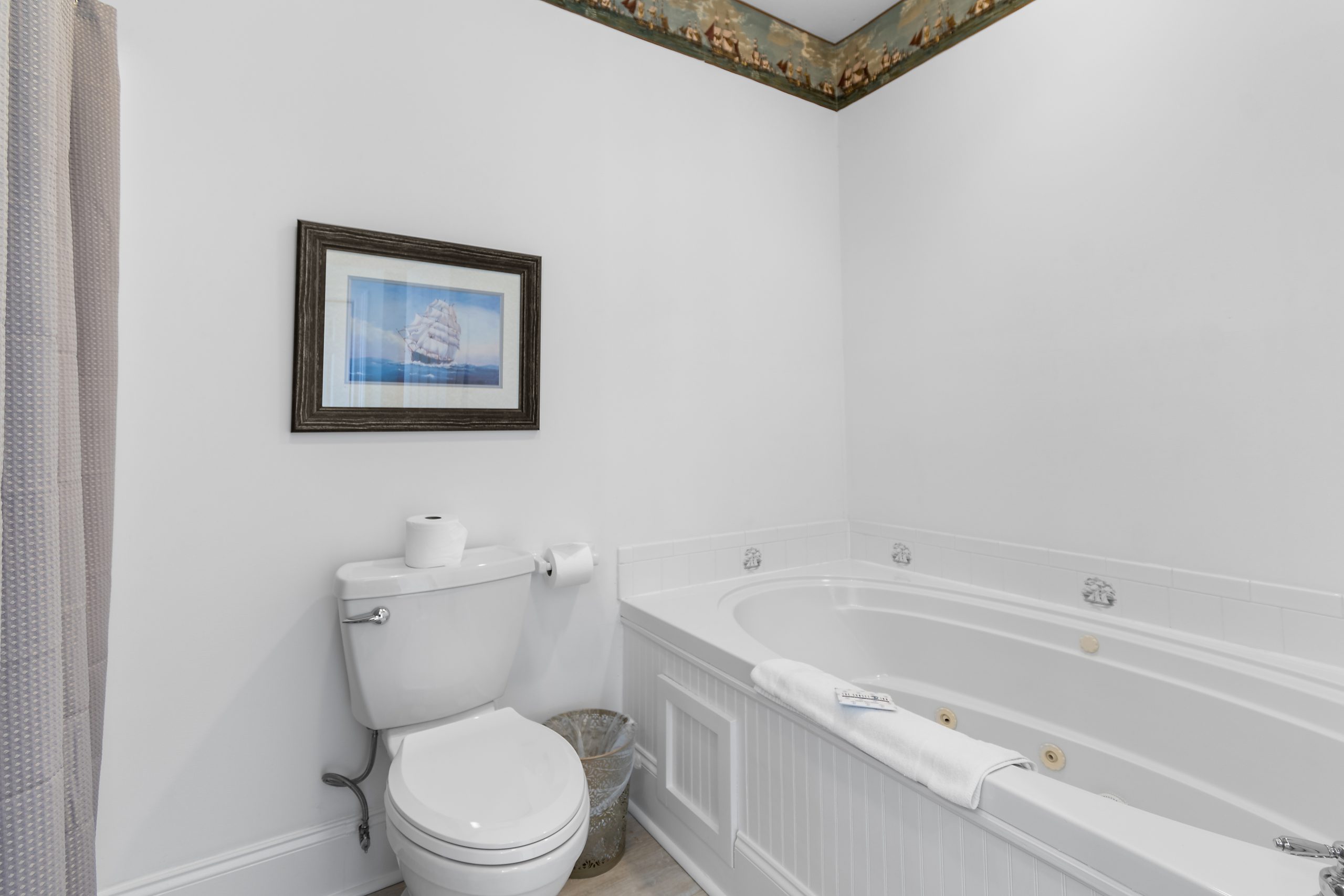 This larger corner room features an expanded corner porch with two rocking chairs and a porch swing, as well as a jetted tub and separate shower.