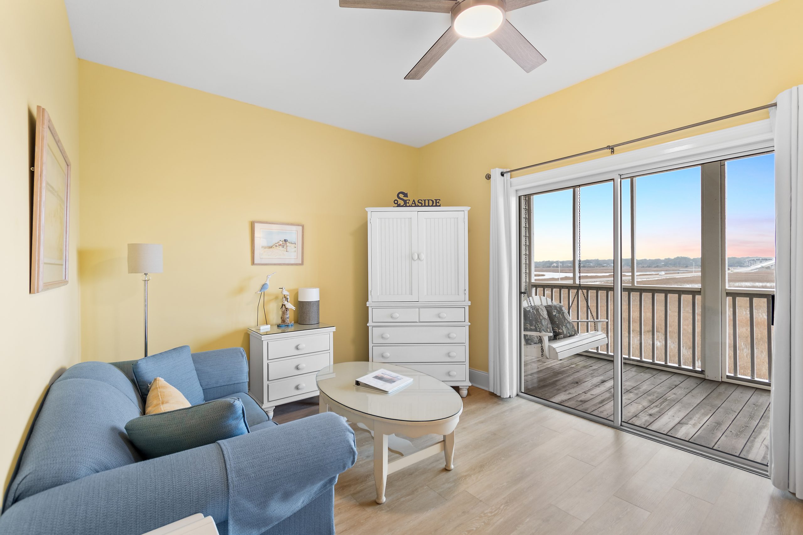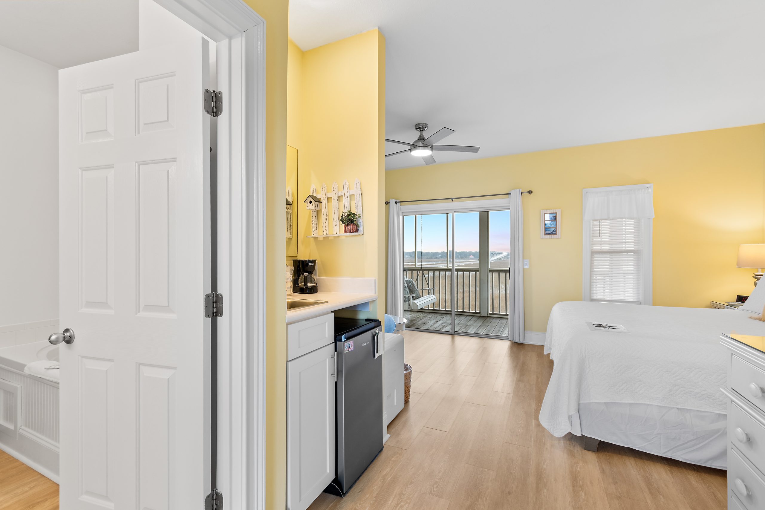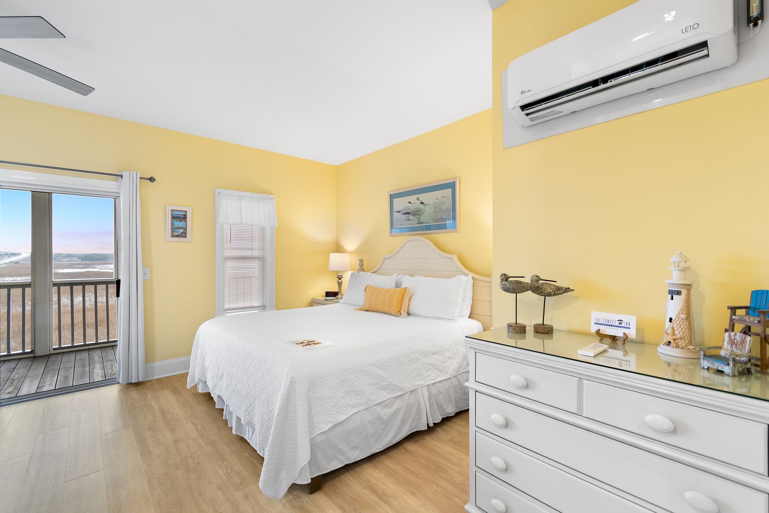 The Bird Island Room is named for the only undeveloped barrier island in North Carolina west of the Cape Fear River and is home to the “Kindred Spirit.” Bird Island is now connected to Sunset Beach since Madd Inlet has filled in and can be reached by walking or boating. This 2nd level bright & cheery grand room incorporates hues of yellow, white and blue. The crisp white furnishings & sunny interior of The Bird Island Room brighten up any Sunset Beach day. This grand room has a larger private screened porch, including a porch swing, rockers, & amazing views. The Bird Island Room is frequently requested and is a reminder of nature, undisturbed.